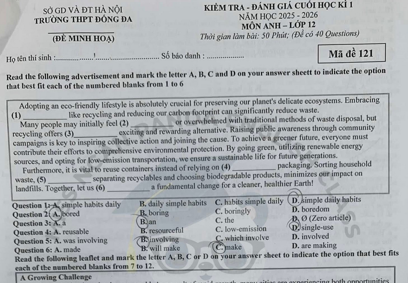 Đề thi học kì 1 lớp 12 môn Anh 2025 - THPT Đống Đa Read the following advertisement and mark the letter A, B, C and D on your answer sheett to indicate the option that best fit each of the numbered blanks from 1 to 6 Adopting an eco-friendly lifestyle is absolutely crucial for preserving our planet's delicate ecosystems. Embracing (1) like recycling and reducing our carbon footprint can significantly reduce waste. or overwhelmed with traditional methods of waste disposal, but Many people may initially feel (2). recycling offers (3) exciting and rewarding alternative. Raising public awareness through community campaigns is key to inspiring collective action and joining the cause. Lưu ý: Đáp án khoanh trong đề thi là của học sinh, có thể không chính xác.