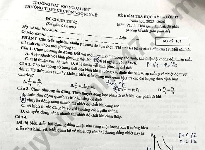 Đề thi học kì 1 lớp 12 môn Lý 2025 - THPT Chuyên Ngoại ngữ Câu 3. Một khối khí (coi là khí lí tưởng) có áp suất p1 = 1,5.103Pa, thể tích Vị = 0,005 m3, nhiệt độ t1 = 270C. Được nung nóng đẳng áp đến nhiệt độ t2 = 167°C. Mỗi phát biểu sau đây là đúng hay sai? a) Áp suất của khí tại trạng thái (2) bằng áp suất của khí tại trạng thái (1) b) Thể tích của khí ở trạng thái (2) khoảng 5,7.10 m - S c) Công mà khối khi thực hiện được có độ lớn bằng 3,5 J. d) Nếu nhiệt lượng mà khí nhận được là 10 J thì độ biến thiên nội năng của khí là 5,5 J. Lưu ý: Đáp án trong đề là bài làm của học sinh, có thể không chính xác