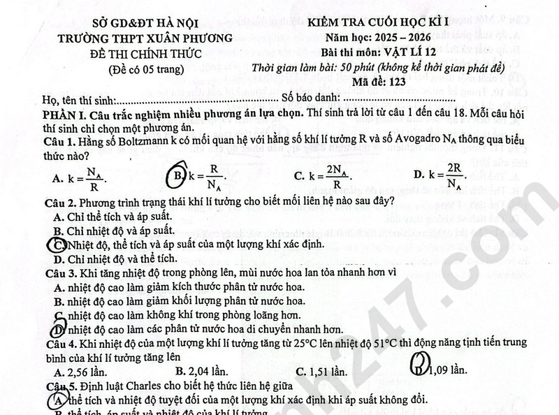 Đề thi học kì 1 lớp 12 môn Lý năm 2025 - THPT Xuân Phương