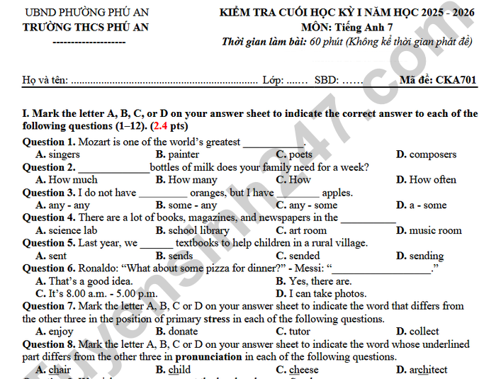 Đề thi học kì 1 lớp 7 môn Anh - THCS Phú An 2025 IV. Read the following passage and mark the letter A, B, C, or D on your answer sheet to indicate the correct option for the True (T)/False (F) statements (20-21) and the multiple-choice questions (22-24). (1.25 pts) The Magic of Pho Imagine walking down a busy street in Vietnam and smelling something amazing. That is the smell of Pho, our country's most famous noodle soup. It is not just breakfast; it is a bowl of happiness! The magic comes from the "broth" (the soup water). Cooks simmer beef bones with cinnamon and star anise all night long to create a special, savory flavor. When you sit down, you get a steaming hot bowl with soft white noodles and tender beef. But wait, you cannot eat it yet! You become the chef at the table. You have to add fresh basil, spicy chili, and a squeeze of sour lime juice to make it perfect. The best feeling is slurping the hot noodles and crunching on fresh bean sprouts. It is warm, delicious, and gives you energy for a long day at school.