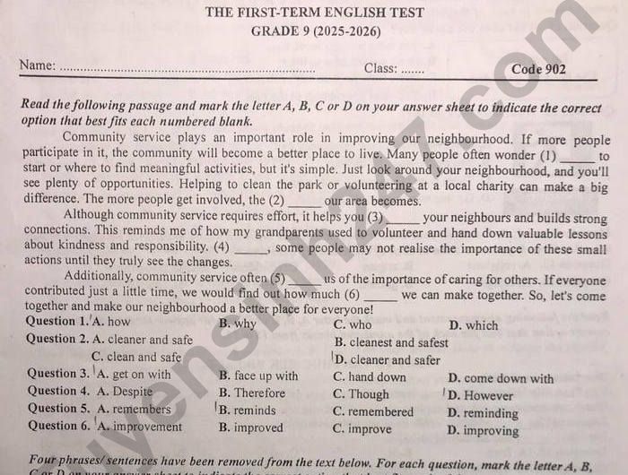 Đề thi học kì 1 lớp 9 môn Anh 2025 - THCS Nguyễn Phong Sắc Mark the letter A, B, C or D on your answer sheet to indicate the sentence that is closest in meaning to the original sentence in each of the following questions. Question 37. When you have a high fever, it is best to rest and drink plenty of water. A. If you have a high fever, you can rest, but drinking water is not important. B. If you have a high fever, you might-net rest and drink plenty of water. C. If you have a high fever, you should rest and drink plenty of water. D. If you have a high fever, you must avoid resting and drinking water.