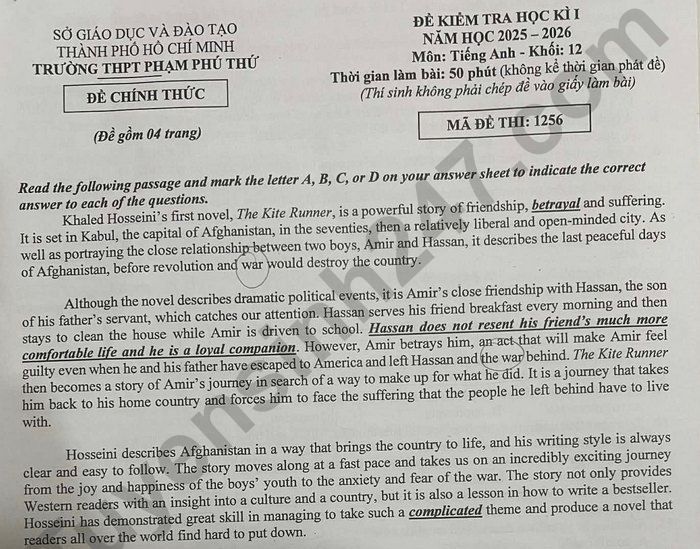 Đề thi học kì 1 môn Anh lớp 12 THPT Phạm Phú Thứ 2025 4. Which of the following statements is TRUE about the overall tone of the novel as described in the passage? A. The tone becomes increasingly hopeless as the war progresses and destroys every aspect of the characters' lives. B. The tone is consistently political, focusing mainly on the transformation of Afghanistan's government. C. The tone remains light-hearted because the story centers on the innocent friendship between two boys. D. The tone is dramatic, yet it ultimately offers a sense of hope despite prolonged suffering. Lưu ý: Đáp án trong đề là bài làm của học sinh, có thể không chính xác