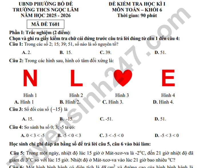 Đề thi học kì 1 môn Toán 6 THCS Ngọc Lâm 2025 Bài 3 (1,5 điểm): Trường THCS Ngọc Lâm tổ chức cho học sinh khối 6 đi học tập, tham quan ngoại khóa tại Bảo tàng Đường mòn Hồ Chí Minh và Bản Mường Xanh. Khi tập trung trước lúc xuất phát, học sinh được xếp thành các hàng 10 người, 15 người hoặc 18 người thì đều vừa đủ, không có ai đứng lẻ hàng. Biết rằng số học sinh tham gia chuyến tham quan nằm trong khoảng từ 250 đến 350 học sinh. Hỏi khối 6 có bao nhiêu học sinh tham gia chuyến tham quan?