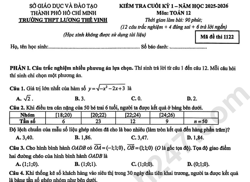 Đề thi học kì 1 môn Toán lớp 12 năm 2025 - THPT Lương Thế Vinh