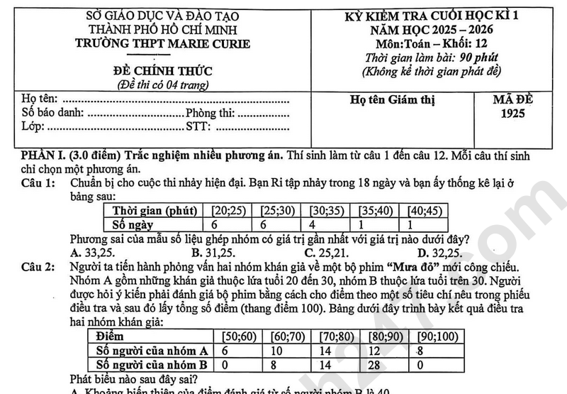 Đề thi học kì 1 môn Toán lớp 12 năm 2025 - THPT Marie Curie