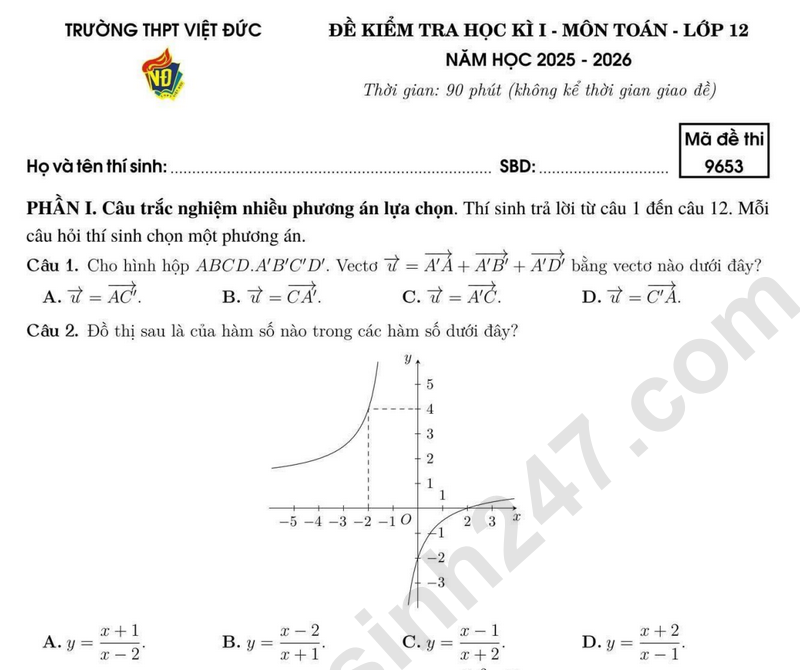 Đề thi học kì 1 môn Toán lớp 12 năm 2025 - THPT Việt Đức