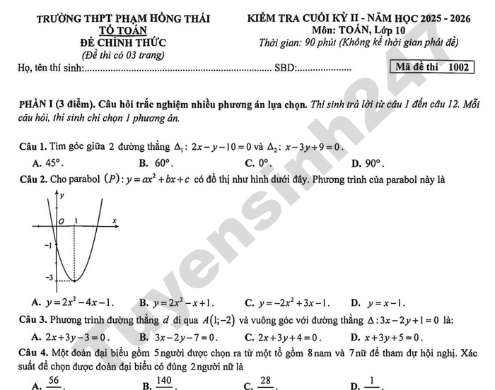 Đề thi học kì 2 lớp 10 môn Toán 2026 - THPT Phạm Hồng Thái Câu 2. Trong mặt phẳng tọa độ Oxy, cho phương trình đường tròn (C):x +y−4x+2y-4=0. a) Tìm tâm và bán kính của đường tròn (C). b) Viết phương trình tiếp tuyến tại điểm M (-1;−1) thuộc đường tròn (C). Câu 3. Lớp 10B có 15 bạn (trong đó có lớp trưởng) tham gia hoạt động trò chơi do Đoàn trường tổ chức. Trong trò chơi chạy tiếp sức, Đoàn trường yêu cầu phải xếp đội hình gồm 6 bạn và thứ tự chạy của họ. Hỏi có bao nhiêu cách xếp đội hình để lớp trưởng là người chạy cuối.