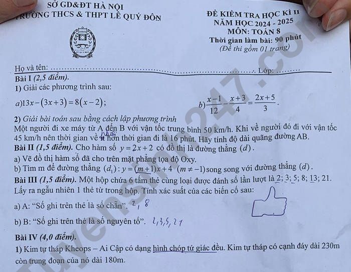 Đề thi học kì 2 lớp 8 môn Toán 2025 - THCS&THPT Lê Quý Đôn