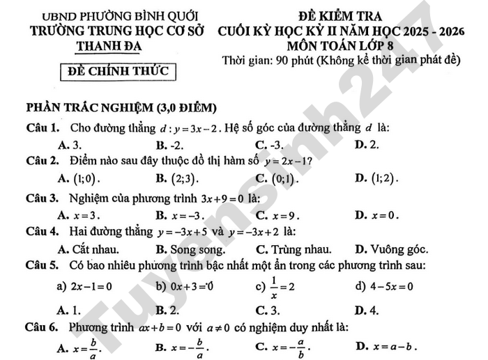 Đề thi học kì 2 lớp 8 môn Toán 2026 - THCS Thanh Đa Bài 2 (1,5 điểm) Cho hai đường thẳng d:y=2x và d':y=-x+3 a) Vẽ hai đường thẳng d và d’ trên cùng một mặt phẳng tọa độ Oxy. b) Tìm tọa độ giao điểm của d và d’ bằng phép tính. Bài 3(1,0 điểm) Một người đi xe đạp từ nhà đến trường với vận tốc 12 km/h. Lúc về, người đó vẫn đi theo con đường cũ vận tốc giảm xuống chỉ còn 10 km/h. Biết tổng thời gian cả đi và về là 33 phút. Tính quãng đường từ nhà đến trường.