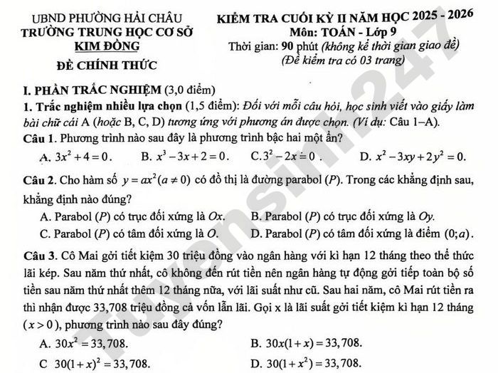 Đề thi học kì 2 lớp 9 môn Toán 2026 - THCS Kim Đồng Bài 5 (1,0 điểm). Trong hội thi “Robotics & Drone Challenge 2026”, trường Kim Đồng đã xuất sắc dành chức vô địch. Đại diện trường tham gia hội thi là hai đội, đội Kim Đồng 1 gồm các bạn: Băng, Hưng, Quân; đội Kim Đồng 2 gồm các bạn: Bảo, Huy, Thịnh. Giáo viên hướng dẫn lựa chọn ngẫu nhiên mỗi đội một bạn để tham gia giao lưu. a) Mô tả không gian mẫu của phép thử. Không gian mẫu có bao nhiêu phần tử? b) Tính xác suất để tên hai bạn được chọn có cùng chữ cái đầu.