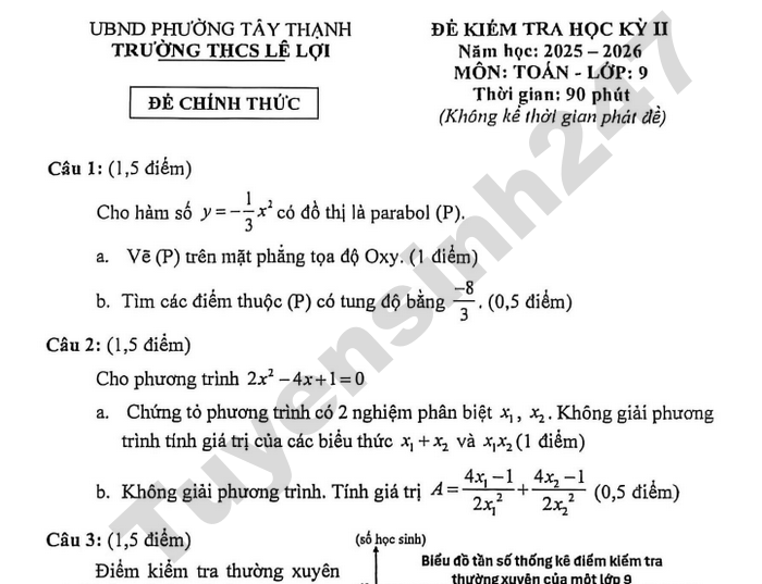 Đề thi học kì 2 lớp 9 môn Toán 2026 - THCS Lê Lợi Câu 5: (1,5 điểm) Đoạn đường AB dài 160 km, một xe máy chạy từ A về hướng B với tốc độ 40 km/h. Sau đó 15 phút, một xe ô tô chạy từ B về hướng A với tốc độ 60km/h. Gọi t (giờ) là số giờ kể từ khi xe máy bắt đầu chạy. a. Viết biểu thức biểu thị khoảng cách của 2 xe theo t (0,25 (giả sử quãng đường AB là một đường thẳng và vận tốc mỗi xe không đổi trong cả quãng đường) (1 điểm) b. Hỏi sau bao lâu từ khi xe ô tô bắt đầu chạy thì hai xe gặp nhau? (0,5 điểm) Theo TTHN DÀNH CHO 2K11 - LỘ TRÌNH ÔN THI VÀO LỚP 10 Tham khảo Khoá học lớp 9 - Lộ trình UP10 tại Tuyensinh247: Xem thêm thông tin và nhận tư vấn miễn phí - TẠI ĐÂY |