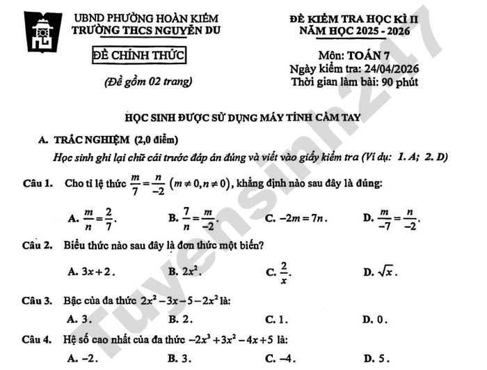 Đề thi học kì 2 môn Toán 7 THCS Nguyễn Du 2026 Bài 3 (1,0 điểm ). Ba lớp 7A ; 7B; 7C của trường THCS Nguyễn Du tham gia Ngày hội trồng cây vì môi trường ở phường Hoàn Kiếm. Biết rằng số cây trồng được của 3 lớp lần lượt tỉ lệ với 10; 12 và 15 và tổng số cây 3 lớp cùng trồng được là 185 cây. Tính số cây mỗi lớp trồng được. Bài 4 (2,5 điểm). Cho AABC vuông tại A, có AB Theo TTHN NẮM CHẮC KIẾN THỨC, BỨT PHÁ ĐIỂM 9,10 LỚP 1 - LỚP 12 CÙNG TUYENSINH247! Nếu em đang: