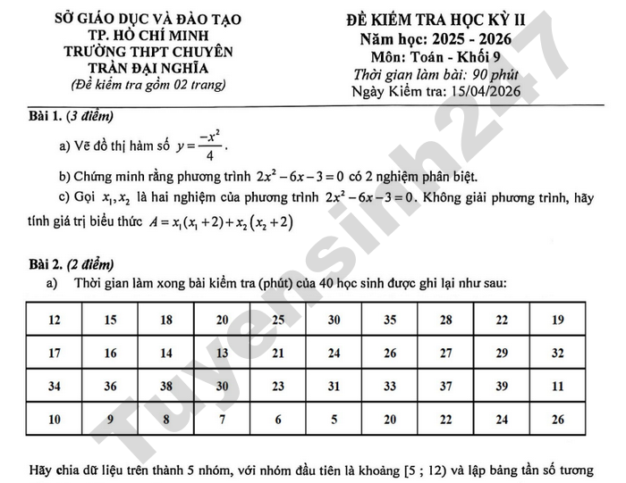 Đề thi học kì 2 môn Toán lớp 9 THPT Chuyên Trần Đại Nghĩa 2026 Bài 3. (2 điểm) a) Nhằm động viên, khen thưởng các em đạt danh hiệu “học sinh giỏi cấp thành phố” năm học 2022-2023, trường THCS A tổ chức chuyến tham quan ngoại khóa tại một điểm du lịch với mức giá ban đầu là 375 000 đồng/người. Biết công ty du lịch giảm 10% chi phí cho mỗi giáo viên và giảm 30% chi phí cho mỗi học sinh. Số học sinh tham gia gấp 4 lần số giáo viên và tổng chi phí tham quan (sau khi giảm giá) là 12 487 500 đồng. Tính số giáo viên và học sinh đã tham gia chuyến đi.
