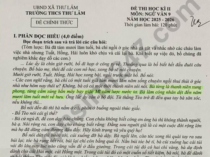 Đề thi học kì 2 môn Văn 9 THCS Thư Lâm năm 2026 Câu 1. (0.5 điểm) Đoạn trích trên được kể theo ngôi thứ mấy? Câu 2. (0.5 điểm) Trong đoạn trích, bổ nhắc đến công việc nào bà từng làm thời thanh niên? Câu 3. (1.0 điểm) Lời thoại sau chứa dựng những tình cảm gì của bố dành cho bà? "- Các con nghĩ rằng, bà chỉ có một tuổi già tám mươi lăm năm sống chuyên ngồi thui thủi ở góc nhà như hôm nay thôi ư? Không, bà có cả một thời thanh niên sôi nổi." Câu 4. (1.0 điểm) Chỉ ra và phân tích tác dụng của biện pháp tu từ ẩn dụ trong câu: “Nói rộng ra, con dạy cho chúng biết rằng: Đằng sau người già là cả một cuộc đời rộng lớn mà họ đã dũng cảm đương đầu đấy."