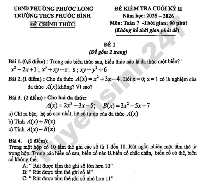 Đề thi học kì 2 năm 2026 môn Toán 7 - THCS Phước Bình Bài 7. (1,5 điểm): Một cửa hàng bán bánh, trung bình mỗi buổi sáng bán được 200 cái bánh mì và 150 cái bánh ngọt, biết giá bán 1 cái bánh mì là x ( đồng) và giá bán 1cái bánh ngọt là y (đồng) a) Viết biểu thức tính số tiền cửa hàng thu được sau khi bán hết số bánh trong buổi sáng. b) Buổi chiều cửa hàng muốn nghỉ bán sớm, nên quyết định giảm giá bánh mì 15% và giảm giá bánh ngọt 20% so với giá ban đầu. Một khách hàng mua 5 cái bánh mì, 2 cái bánh ngọt vào buổi chiều và trả hết 90 500 đồng, biết giá bán của cái bánh mì khi chưa giảm là 10 000 đồng. Tính giá bán của 1 cái bánh ngọt khi chưa giảm giá ?
