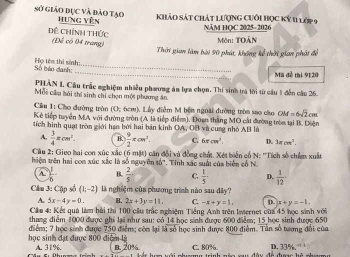 Đề thi học kì 2 năm 2026 Sở GD Hưng Yên - môn Toán lớp 9 Câu 6: Trong mặt phẳng tọa độ Oxy, vẽ Parabol (P): y=2x và đường thẳng (d): y = mx + 1, Gọi giá trị của tham số m để (d) cắt (P) tại hai điểm phân biệt A, B sao cho diện tích tam giác OAB nhỏ nhất là a thì giá trị của biểu thức 5a+ V7 là (kết quả làm tròn đến chữ số thập phân thứ hai) Lưu ý: Đáp án trong đề là bài làm của học sinh, có thể không chính xác