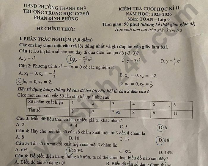 Đề thi học kì 2 năm 2026 THCS Phan Đình Phùng - môn Toán lớp 9 Câu 2: (1 điểm) Chạy bộ là một hoạt động thể thao rất tốt cho sức khỏe. Một bạn học sinh dự định chạy bộ từ công viên A đến công viên B với vận tốc không đổi. Sau khi chạy được 15 phút thì bạn dừng lại nghỉ 6 phút. Để hoàn thành quãng đường đúng thời gian dự định, bạn phải tăng vận tốc thêm 2 km/h. Biết quãng đường AB dài 6 km. Tính vận tốc ban đầu của bạn học sinh đó. Lưu ý: Đáp án trong đề là bài làm của học sinh, có thể không chính xác