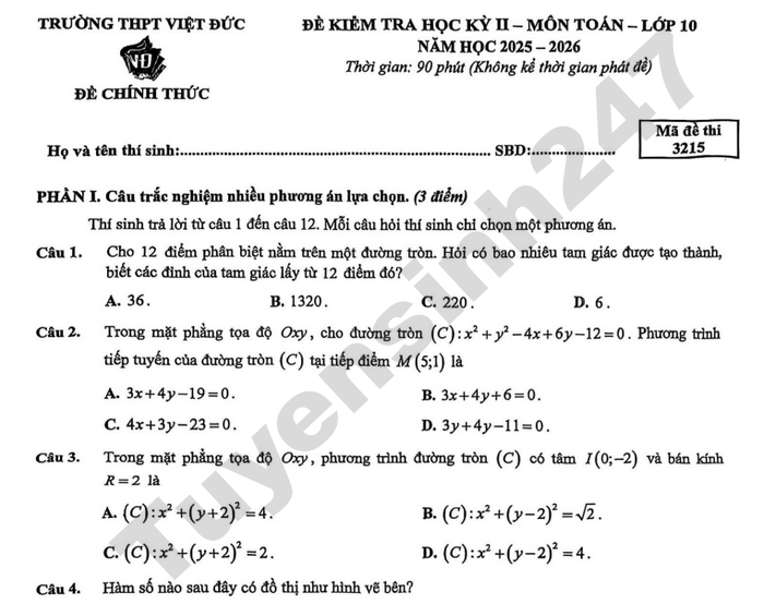Đề thi học kì 2 năm 2026 THPT Việt Đức - lớp 10 môn Toán Câu 2. Một nhóm có 14 bạn học sinh, trong đó có hai bạn tên An và Bình. Thầy giáo cần chọn 6 bạn học sinh đi dự hội thảo. a) Có 3003 cách chọn 6 bạn bất kỳ. b) Có 2574 cách chọn 6 bạn trong đó có đúng một trong hai bạn An và Bình. c) Có 924 cách chọn 6 bạn trong đó cả hai bạn An và Bình đều không có mặt. d) Có 1848 cách chọn 6 bạn trong đó có cả hai bạn An và Bình.