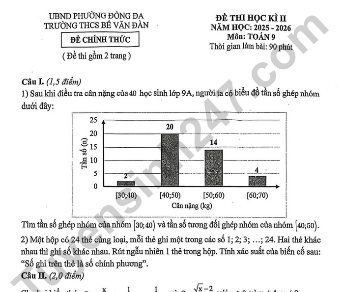 Đề thi học kì 2 Toán lớp 9 THCS Bế Văn Đàn 2026 Câu III. (2,5 điểm) 1) Giải bài toán sau bằng cách lập phương trình hoặc hệ phương trình: Một ca nô xuôi dòng từ A đến B cách nhau 63 km, rồi ngược dòng trở lại 56 km. Tổng thời gian cả đi lẫn về của ca nô hết 3 giờ 45 phút. Tính vận tốc thực của ca nô biết vận tốc dòng nước là 4 km/h.