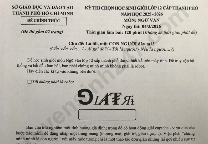 Đề thi học sinh giỏi lớp 12 TPHCM môn Văn 2026 Bạn vừa trải nghiệm một tình huống giả định; trong đó có hoạt động giải captcha - vượt qua các bước xác minh để đăng nhập một trang mạng (thương mại, giải trí, giáo dục,...). Việc phải "chứng minh mình là con người" với máy móc tưởng chỉ là một thao tác đơn giản nhưng lại gợi nhiều suy tư về giá trị của con người".