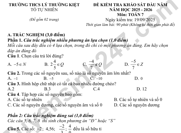Đề thi khảo sát lớp 7 môn Toán 2025 - THCS Lý Thường Kiệt Phần 3: Câu hỏi trắc nghiệm trả lời ngắn (1,0 điểm) Thí sinh trả lời từ câu 9 đến câu 12. Viết câu trả lời ngắn/kết quả của mỗi câu hỏi: Câu 9. Làm tròn số 12,356 đến số thập phân thứ hai kết quả là: Trả lời ……………………………………… Câu 10. Cho hình chữ nhật có chiều dài 12cm và diện tích 2 72 cm. Chiều rộng của hình chữ nhật đó là: Trả lời ………………………………………