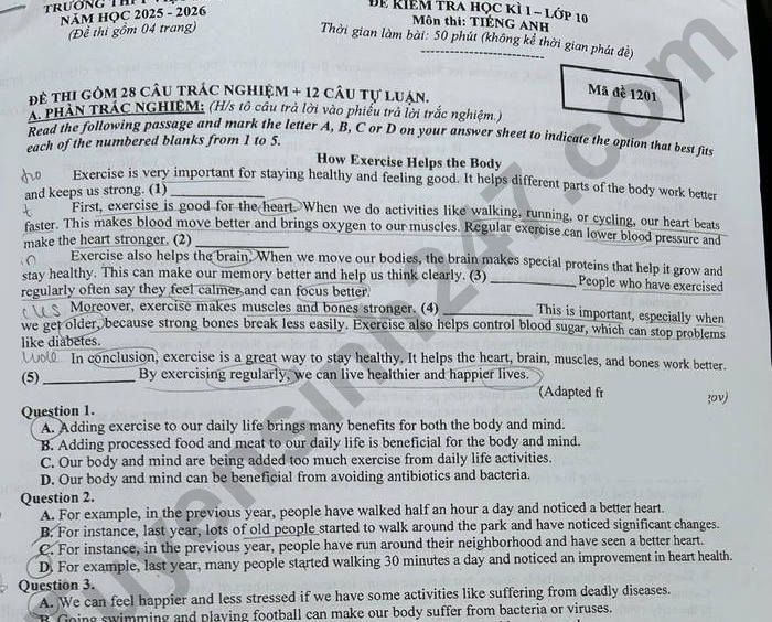 Đề thi kì 1 lớp 10 môn Anh THPT Việt Đức 2025 Question 27. According to the passage, what role do exergames play in supporting players' physical well-being A. They encourage bodily movement through interactive gameplay that can motivate consistent exercise. B. They provide structured workout routines that replace traditional gym training for most users. C. They reduce the need for medical supervision by allowing patients to design their own rehabilitation plans. D. They enable users to build athletic skills by simulating competitive sports in a controlled environment. Lưu ý: Đáp án trong đề là bài làm của học sinh, có thể không chính xác
