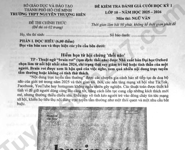 Đề thi kì 1 lớp 10 môn Văn 2025 - THPT Nguyễn Thượng Hiền Câu 1. (0.75 điểm) Đề tài của văn bản trên là gì? Em dựa vào đầu để xác định điều đó? Câu 2. (0.75 điểm) Chỉ ra một trích dẫn thuộc kiểu trích dẫn trực tiếp có trong văn bản. Câu 3. (1.00 điểm) Theo em, đoạn văn được in đậm đã sử dụng phương thức thuyết minh kết hợp với phương thức nào? Hãy chỉ ra và phân tích mục đích của việc lồng ghép các yếu tố này trong đoạn văn. Câu 4. (1.00 điểm) Phương tiện phi ngôn ngữ được sử dụng trong văn bản trên là gì? Nêu tác dụng của cách trình bày này trong việc thể hiện nội dung văn bản.