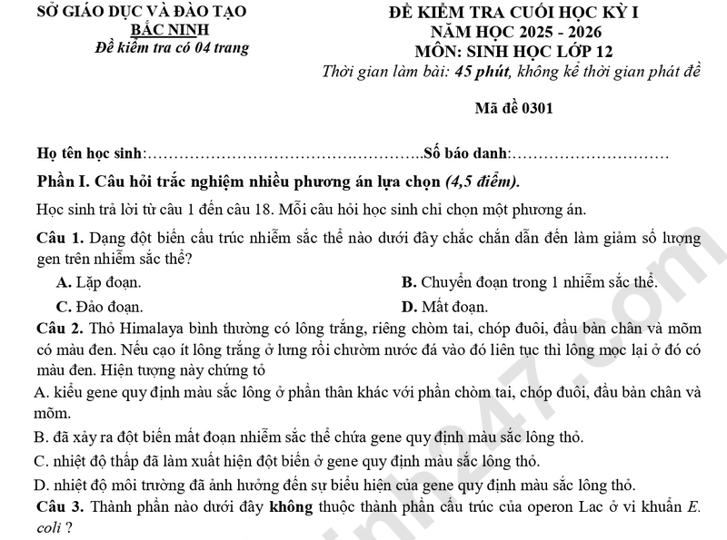 Đề thi kì 1 lớp 12 môn Sinh 2025 - Sở GD Bắc Ninh
