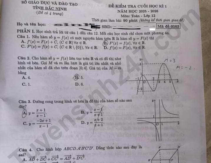 Đề thi kì 1 lớp 12 môn Toán 2025 - Sở GD Bắc Ninh