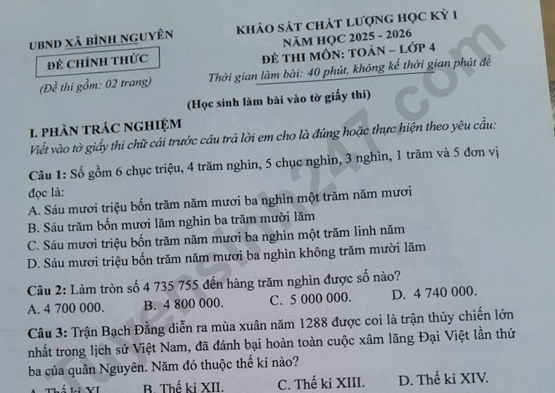 Đề thi kì 1 lớp 4 môn Toán 2025 - Xã Bình Nguyên Câu 1: Số gồm 6 chục triệu, 4 trăm nghìn, 5 chục nghìn, 3 nghìn, 1 trăm và 5 đơn vị đọc là: A. Sáu mươi triệu bốn trăm năm mươi ba nghìn một trăm năm mươi B. Sáu trăm bốn mươi lăm nghìn ba trăm mười lăm C. Sáu mươi triệu bốn trăm năm mươi ba nghìn một trăm linh năm D. Sáu mươi triệu bốn trăm năm mươi ba nghìn không trăm mười lăm Câu 2: Làm tròn số 4 735 755 đến hàng trăm nghìn được số nào? A. 4 700 000. B. 4 800 000. C. 5 000 000. D. 4 740 000.