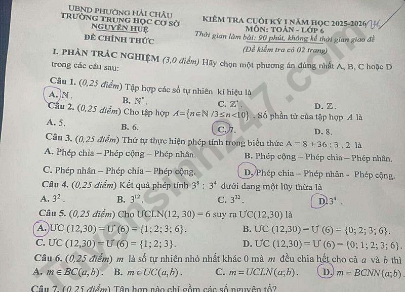 Đề thi kì 1 lớp 6 môn Toán năm 2025 - THCS Nguyễn Huệ Câu 2. (1,0 điểm) a) Biểu diễn các số nguyên sau trên trục số: -3; 0; 2. b) Tính hợp lý giá trị của biểu thức A=(−314)–(–2025 + x) với x=-314.- 2025 Câu 3. (0,75 điểm) Số 2025 có chia hết cho 9 không? Vì sao? Câu 4. (1,0 điểm) Hai vận động viên chạy xung quanh một sân vận động. Hai vận động viên xuất phát tại cùng một thời điểm, cùng vị trí và chạy cùng chiều. Vận động viên thứ nhất chạy một vòng sân hết 360 giây, vận động viên thứ hai chạy một vòng sân mất 420 giây . Hỏi sau bao nhiêu phút họ gặp lại nhau, biết tốc độ di chuyển của họ không đổi? Lưu ý: Đáp án khoanh trong đề thi là của học sinh, có thể không chính xác.