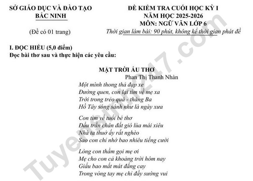 Đề thi kì 1 lớp 6 môn Văn 2025 - Sở GD Bắc Ninh Lòng con thầm gọi mẹ ơi Mẹ cho con cả khoảng trời hôm nay Giấu bao mất mát đắng cay Trong vòng tay mẹ chỉ đầy sướng vui Mong sao mẹ mãi tươi cười Cho con gặp lại mặt trời ấu thơ. (Con muốn mặc áo đỏ đi chơi, Phan Thị Thanh Nhàn, NXB Kim Đồng, 2016, tr.3,5) Câu 1. Xác định thể thơ của bài thơ. Câu 2. Tìm từ láy, từ ghép trong các từ sau: thong thả, tươi cười, sướng vui, trong trẻo. Câu 3. Chỉ ra điều người con trong bài thơ chỉ nhớ khi tìm về tuổi bé thơ.