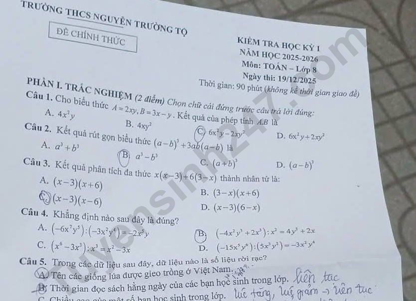 Đề thi kì 1 lớp 8 môn Toán 2025 - THCS Nguyễn Trường Tộ Câu 5. Trong các dữ liệu sau đây, dữ liệu nào là số liệu rời rạc A. Tên các giống lửa được gieo trồng ở Việt Nam By Thời gian đọc sách hằng ngày của các bạn học sinh trong lớp C. Chiều cao của một số bạn học sinh trong lớp D. Sĩ số của các lớp khối 8 của một trường THCS Câu 6. Khẳng định nào sau đây là sai? A. Hình bình hành có hai cạnh kể bằng nhau là hình thoi. B. Hình bình hành có các cạnh đối bằng nhau là hình thoi. C. Hình bình hành có hai đường chéo vuông góc với nhau là hình thoi. D. Hình bình hành có một đường chéo là đường phân giác của một góc là hình thoi. Lưu ý: Đáp án khoanh trong đề thi là của học sinh, có thể không chính xác.