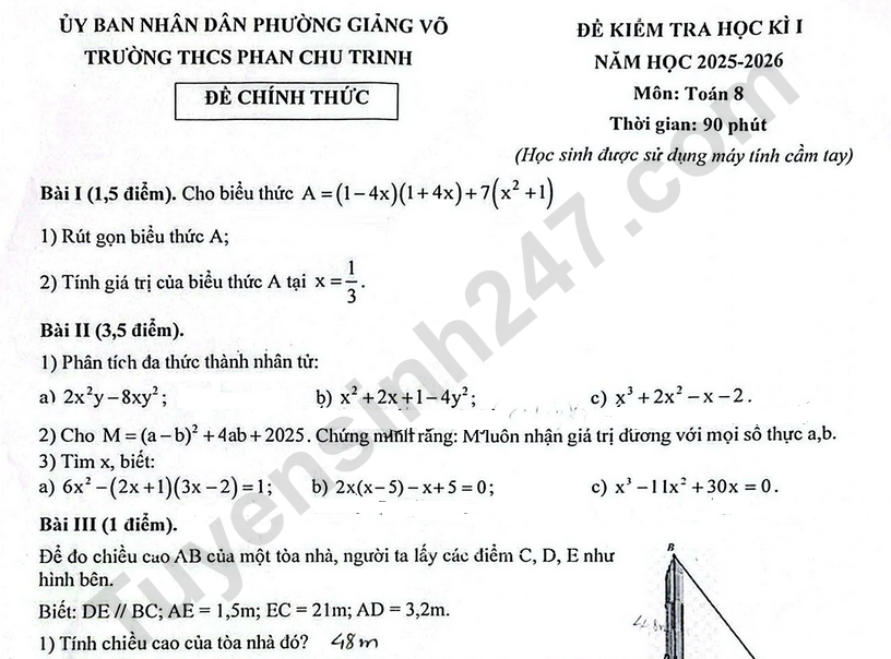 Đề thi kì 1 lớp 8 môn Toán - THCS Phan Chu Trinh 2025 Bài 3: Để đo chiều cao AB của một tòa nhà, người ta lấy các điểm C, D, E như hình bên. Biết: DE // BC; AE = 1,5m; EC = 21m; AD = 3,2m. 1) Tính chiều cao của tòa nhà đó? 2) Người nhân viên cần lau cửa kính bên ngoài tòa nhà từ vị trí điểm B đến điểm D, biết 1 phút người đó di chuyển được 0,16m. Hỏi người nhân viên mất bao nhiêu lâu để di chuyển từ vị trí điểm B đến điểm D?
