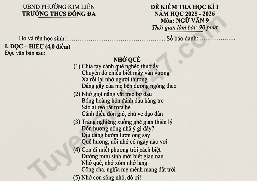 Đề thi kì 1 lớp 9 môn Văn 2025 - THCS Đống Đa Câu 1 (1,0 điểm). Bài thơ được làm theo thể thơ gì? Chỉ ra đặc điểm của vần trong khổ thơ thứ nhất. Câu 2 (1,0 điểm). Ở khổ thơ thứ hai, quê hương hiện lên qua những hình ảnh, chi tiết nào? Nêu ý nghĩa của những hình ảnh, chi tiết đó trong việc gợi lại ký ức của nhân vật trữ tình và tái hiện bản sắc của làng quê Việt Nam xưa?
