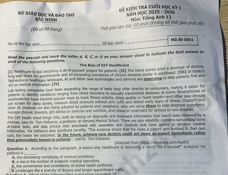 Đề thi kì 1 môn Anh lớp 12 năm 2025 - Sở GD Bắc Ninh