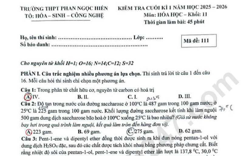 Đề thi kì 1 môn Hóa lớp 11 năm 2025 - THPT Phan Ngọc Hiển Câu 2: Độ tan trong nước của đường saccharose ở 100°C là 487 gam trong 100 gam nước; ở 25°C là 225 gam trong 100 gam nước. Khối lượng đường saccharose kết tinh khi làm nguội 74,* (500 gam dung dịch saccharose bão hoà ở 100°C xuống 25°C là bao nhiêu? (Giả sử nước không bay hơi trong quá trình làm nguội, kết quả làm tròn đến hàng đơn vị). A. 223 gam. B. 69 gam. C.275 gam. D. 62 gam. Lưu ý: Đáp án trong đề thi là của học sinh, có thể không chính xác