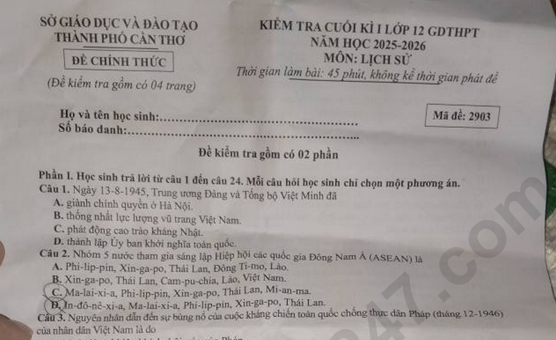 Đề thi kì 1 môn Lịch sử lớp 12 năm 2025 - Sở GD Cần Thơ