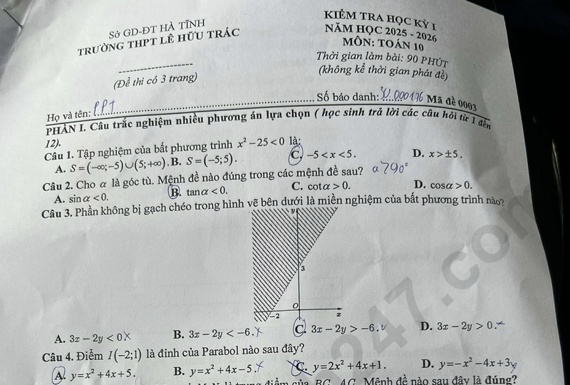Đề thi kì 1 môn Toán lớp 10 năm 2025 - THPT Lê Hữu Trác Câu 1. Một trận bóng đá được tổ chức tại một sân vận động có sức chứa 40000 người, ban tổ chức phát hành hai loại vé là 400000 đồng và 200000 đồng. Do điều kiện sân đấu nên số lượng vé có giá 400000 đồng không lớn hơn số lượng vé có giá 200000 đồng. Để an toàn phòng dịch, liên đoàn bóng đá yêu cầu số lượng vé phát hành không được quá 30% sức chứa của sân. Để tổ chức được trận đấu thì số tiền thu được qua bán vé không được ít hơn 3 tỉ đồng. Gọi x, y lần lượt là số vé giá 400000 đồng và 200000 đồng được bán ra. Tính doanh thu bán vé lớn nhất mà ban tổ chức có thể thu được ( đơn vị tỉ đồng) Lưu ý: Đáp án trong đề thi là của học sinh, có thể không chính xác