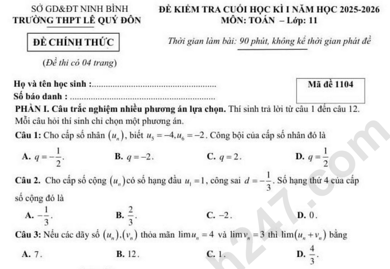 Đề thi kì 1 môn Toán lớp 11 năm 2025 - THPT Lê Quý Đôn