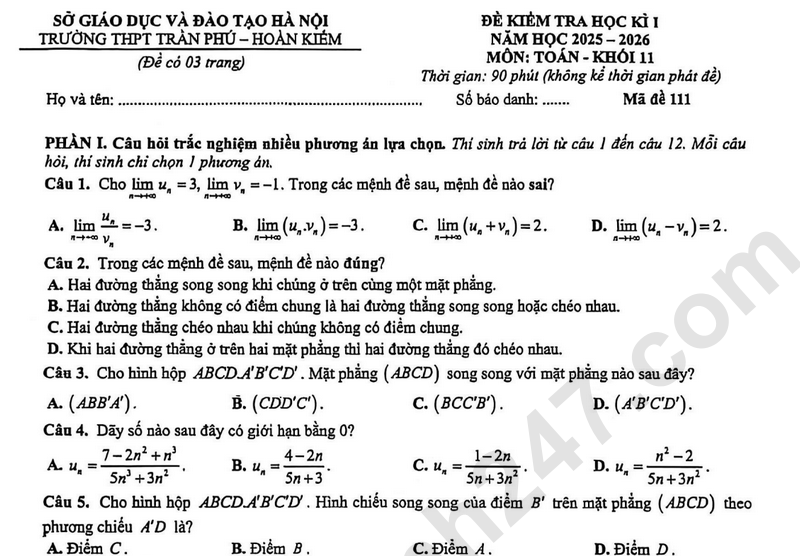 Đề thi kì 1 môn Toán lớp 11 năm 2025 - THPT Trần Phú Câu 2. Trong các mệnh đề sau, mệnh đề nào đúng? A. Hai đường thẳng song song khi chúng ở trên cùng một mặt phẳng. B. Hai đường thẳng không có điểm chung là hai đường thẳng song song hoặc chéo nhau. C. Hai đường thẳng chéo nhau khi chúng không có điểm chung. D. Khi hai đường thẳng ở trên hai mặt phẳng thi hai đường thẳng đó chéo nhau.