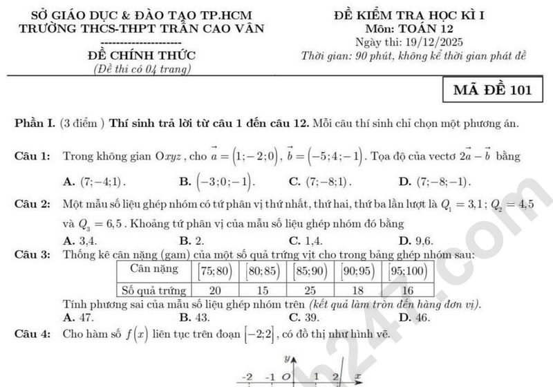 Đề thi kì 1 môn Toán lớp 12 năm 2025 - THCS - THPT Trần Cao Vân