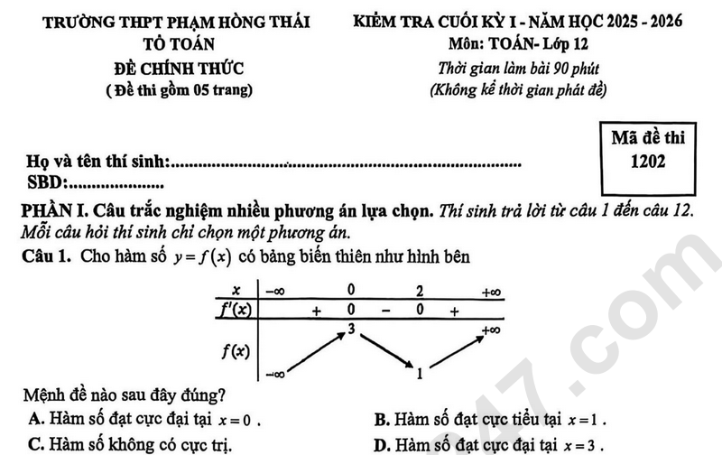 Đề thi kì 1 môn Toán lớp 12 năm 2025 - THPT Phạm Hồng Thái