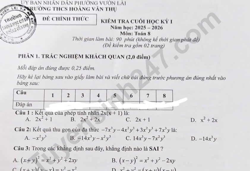 Đề thi kì 1 môn Toán lớp 8 năm 2025 - THCS Hoàng Văn Thụ