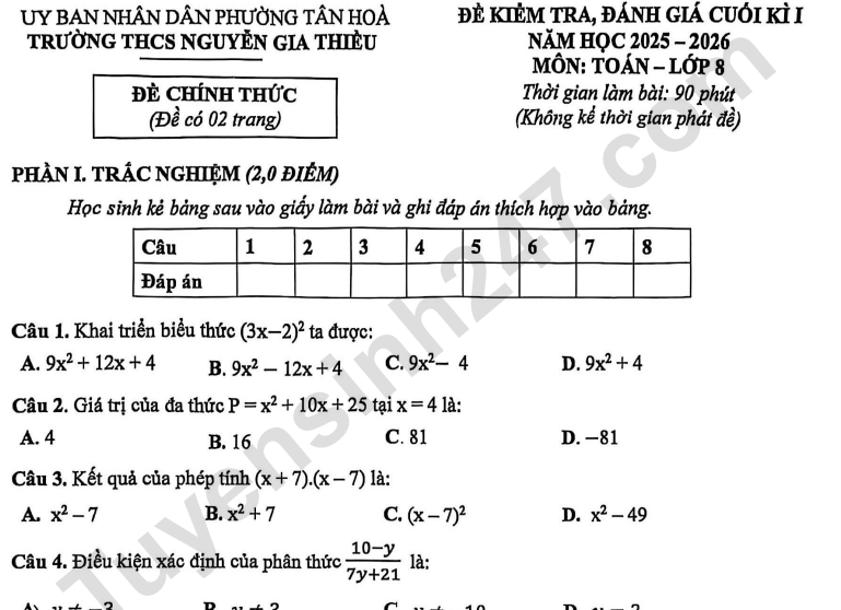 Đề thi kì 1 môn Toán lớp 8 năm 2025 - THCS Nguyễn Gia Thiều a) Em hãy cho biết khối nào bị ghi sai số liệu về số học sinh trong khối? Vì sao? b) Biết tổng số học sinh của trường là 1331 học sinh. Nhận định “Khối 8 có số học sinh ít nhất trong trường” là đúng hay sai? Vì sao? c) Em hãy tính số trung bình cộng số học sinh mỗi lớp tại trường trung học cơ sở đó. (Kết quả làm tròn đến chữ số hàng đơn vị) Bài 4. (1,0 điểm): Một cây tre có chiều cao ban đầu là DA, bị gió thổi gãy ngang thân. Chỗ bị gãy cách gốc cây 1 đoạn AC=4m, ngọn cây chạm đất cách gốc 1 đoạn AB=3 m. Hỏi ban đầu cây cao bao nhiêu mét?