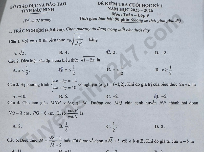 Đề thi kì 1 môn Toán lớp 9 - Sở GD Bắc Ninh 2025 Câu 14. Cho đường tròn tâm I bán kính 5cm và một điểm M bất kì sao cho IM = d. Điểm M thuộc đường tròn tâm I khi Câu 15. Cho a,b là hai số không âm. Khẳng định nào sau đây là đúng? Câu 16. Giông bão thổi mạnh, một cây bị gãy gập xuống làm ngọn cây chạm đất và tạo với phương nằm ngang một góc 45° (minh hoạ ở hình vẽ). Người ta đo được khoảng cách từ chỗ ngọn cây chạm đất đến gốc cây là 4,5m. Giả sử cây mọc vuông góc với mặt đất, chiều cao của cây khi chưa gây là (làm tròn kết quả đến hàng phần mười) Lưu ý: Đáp án khoanh trong đề thi là của học sinh, có thể không chính xác.