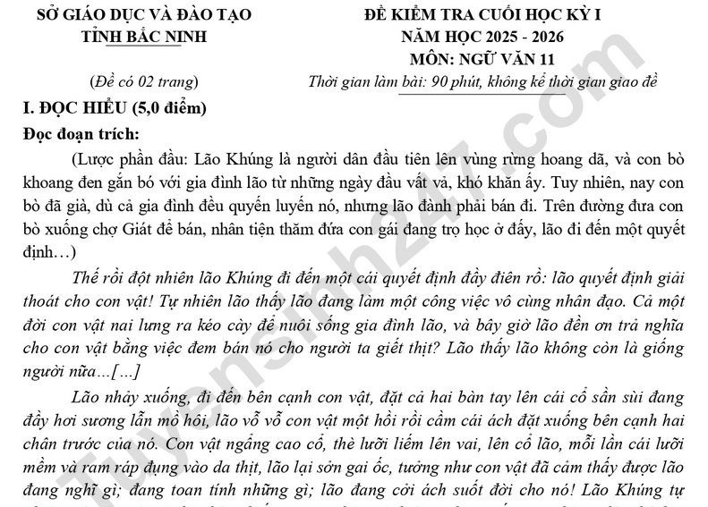 Đáp án đề thi kì 1 môn Văn lớp 11 - Sở GD Bắc Ninh 2025