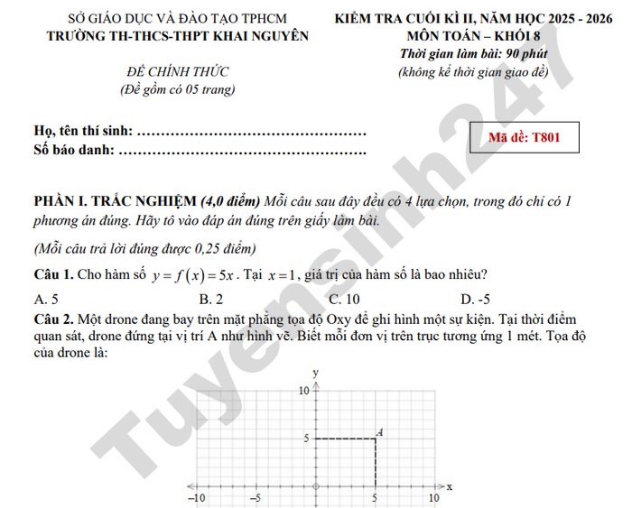 Đề thi kì 2 môn Toán 8 TH-THCS-THPT Khai Nguyên 2026 - Có đáp án Câu 3. (1,0 điểm) Trong đợt đi học tập trải nghiệm năm 2022, trường Khai Nguyên tổ chức cho các em tham quan vườn trái cây ở xã Lê Minh Xuân, Bình Chánh. Sau khi tham quan, nhà trường thấy trái cây ở đây tươi và giá khá rẻ so với thị trường, nên nhà trường đã quyết định mua một số dừa và dưa lưới với tổng số lượng cả hai loại là 150 trái. Giá tiền của mỗi trái dừa là 5000 đồng, và mỗi trái dưa lưới là 40000 đồng. Sau khi tính toán, số tiền mà nhà trường phải trả cho chủ vườn là 3200000 đồng. Tính số lượng dưa lưới và số lượng trái dừa mà nhà trường đã mua.