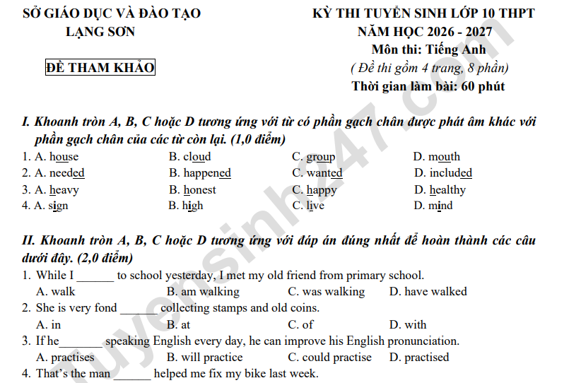 Đáp án đề thi minh họa vào lớp 10 môn Anh 2026 - Sở GD Lạng Sơn