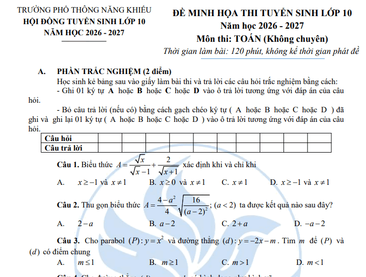 Đề minh họa kèm đáp án của trường Phổ thông Năng khiếu như sau: